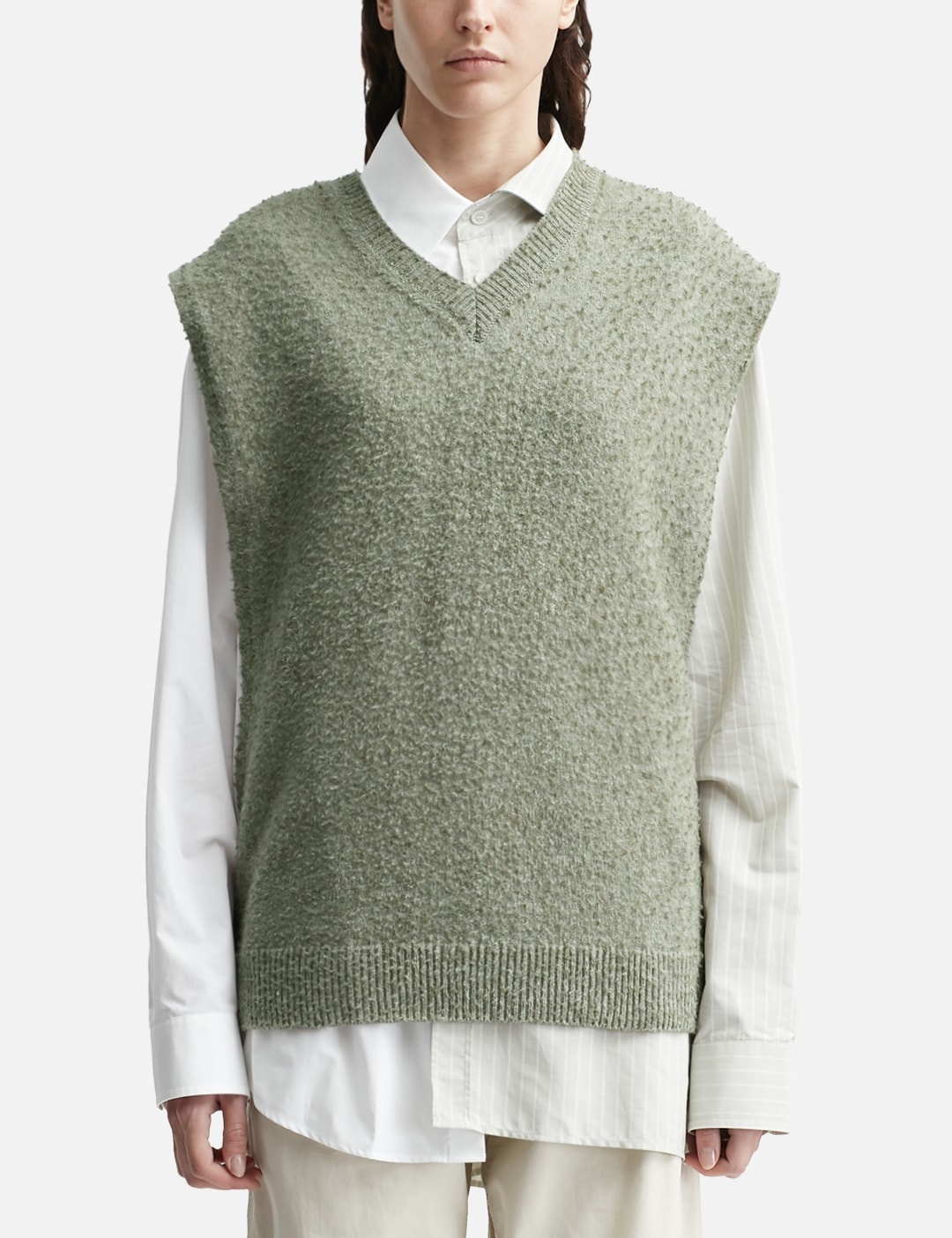 - Maison Margiela - Stole - Wool blend - Oversized fit - V-neck - Side openings and single-button fastening - Ribbed trims - Rear signature stitch accent - Color: Sage Green - Material: 68% Wool, 29% Cashmere, 3% Nylon - See more Vests and Clothing SIZING Male - Model wears size M - Model measures: Height 189cm, Chest 31.5"/80cm, Waist 27”/69cm, Hip 34.3’’/87cm - Model wears size S - Model measures: Height 175cm, Chest 32’/81cm, Waist 24.5’’/61.2cm, Hip 35’’/88.9cm