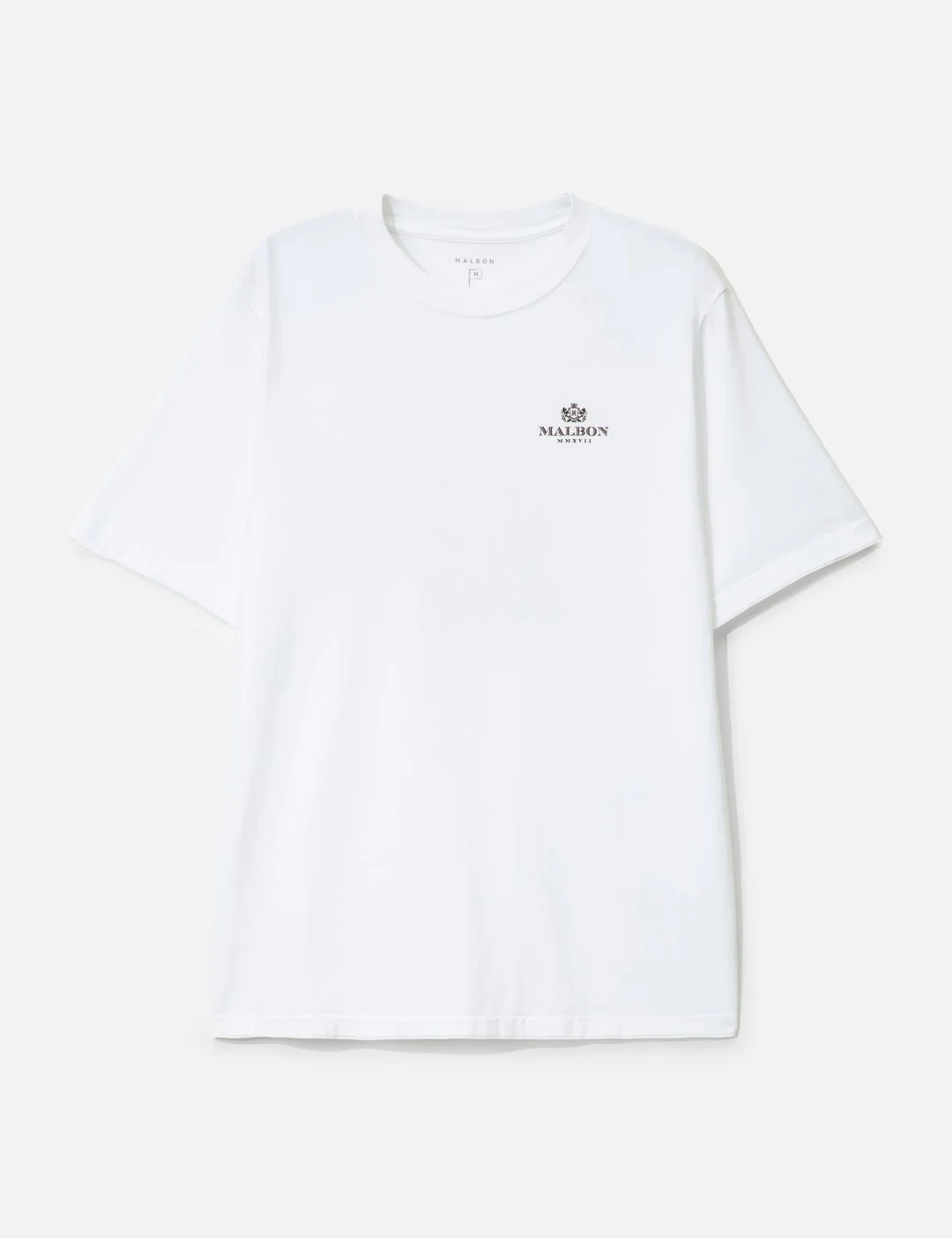 - Malbon Golf - Bermuda Monarch T-shirt - Relaxed fit - Ribbed crewneck - Short sleeve - Printed Malbon 2017 crest logo on left chest - Printed crowned buckets logo on back - Woven Malbon flag label on left seam - Made in USA - Color: White - Material: 100% Cotton - See more SS T-Shirts, T-Shirts and Clothing - Model wears size M - Model measures: Height 186cm, Chest 34”/86cm, Waist 28”/71cm, Hip 36”/91cm - Vendor Code: M-9601-WHT