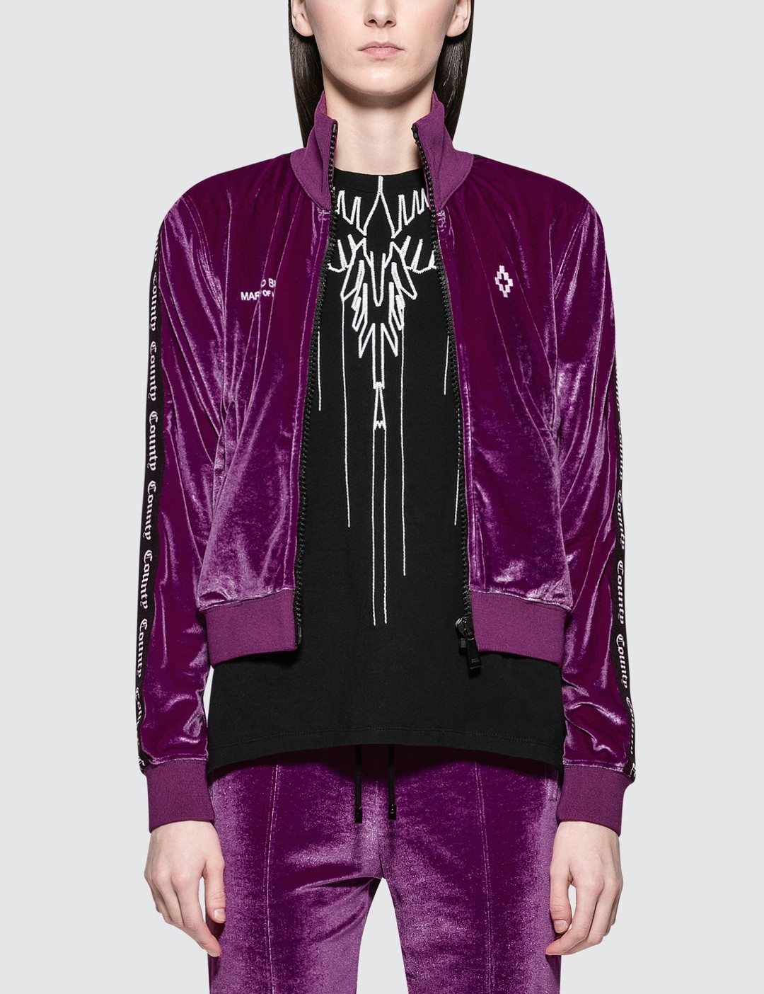 - Marcelo Burlon - Marcelo Burlon - County Tape Track - High collar - Zip fastening on front - Ribbed cuffs and hem - Logo on chest - Graphic on sleeves - Velvet effect - 93% Polyester, 7% Elastane - See more Jackets and Clothing SIZING - Fits true to size, take your normal size - Designed to be worn fitted - Model wears size S - Model measures: Height 176cm, Chest 32”/81cm, Waist 23”/59cm, Hip 35”/90cm