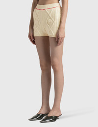 - Marine Serre - Cable Knit Mini Shorts - Branded motifs in cable knit on front - Ribbed waist and cuffs - Contrasting stitching on the waist - Made with one upcycled multicolour sweater - Color: Beige - Material: 100% Wool - See more Shorts and Clothing SIZING - Model wears size s - Model measures: Height 170cm, Chest 29”/75cm, Waist 22”/57cm,Hip 33”/86cm