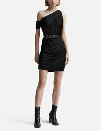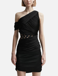 - Marine Serre - Jersey Body Shelter Draped Dress - Stretch jersey fabric - Off shoulder design - Draping at front - Side zip closure - Contrasting crescent moon motif panel at top - Unlined - Color: Black - Material: Main Fabric: 95% Viscose, 5% Elastane; Second Fabric: 78% Recycled Polyamide, 22% Elastane - See more Dresses and Clothing SIZING - Model wears size S - Model measures: Height 179cm, Chest 32”/81cm, Waist 23’’/58.42cm, Hip 35’’/88.9cm