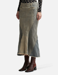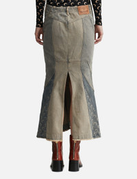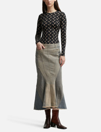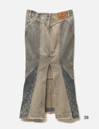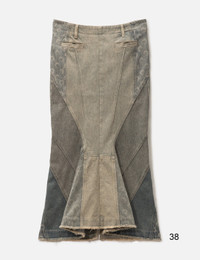 - Marine Serre - Regenerated Denim Flared Skirt - Midi-length - Flared cut - Rear zip closure - Panelled design - Back slit - Darted - Leather patch on rear waist - Two welt pockets at front - Raw edge straight hem - Color: Regenerated Denim Gray - Material: 100% Cotton - See more Skirts and Clothing SIZING - Model wears size 38 - Model measures: Height 187cm, Chest 36”/91cm, Waist 29”/74cm, Hip 37”/94cm