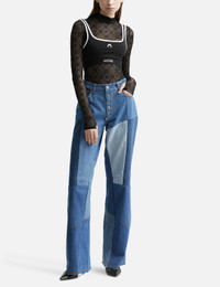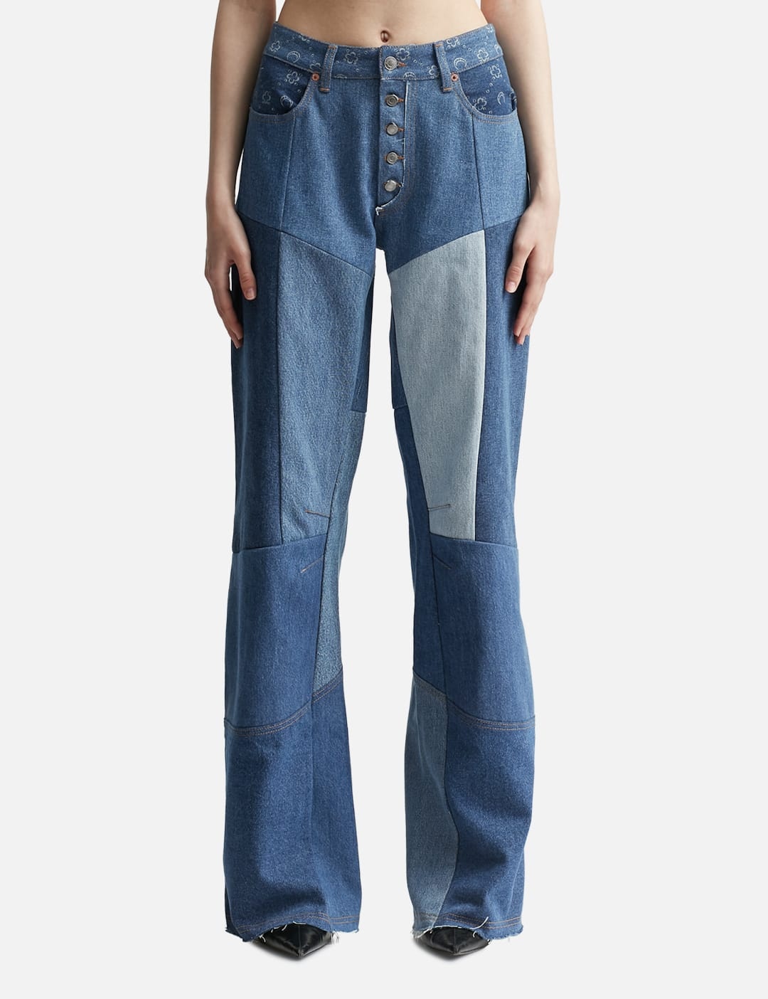 - Marine Serre - Regenerated Denim Monogram Wide Leg Trousers - High rise - Button fly - Patchwork construction - Printed clover and crescent moon pattern to the waist panels - Four-pocket styling - Darted knees - Curved back yoke - Wide leg with raw edge cuffs - Color: Medium Dark Blue Monogram - Material: 100% Recycled Cotton Denim - See more Jeans and Clothing SIZING - Model wears size 36 - Model measures: Height 176cm, Chest 32”/81cm, Waist 23”/59cm, Hip 35”/90cm