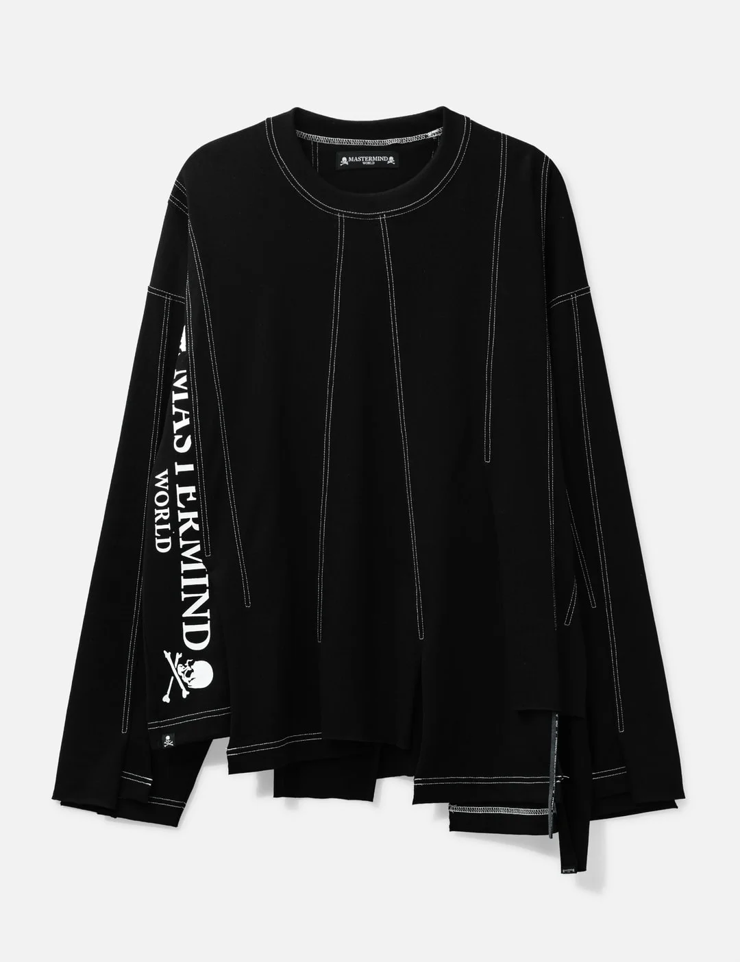 - Mastermind World - Reconstructed Boxy LS Tee - Boxy fit - Made from an original jersey knit fabric, a blend of Suvin Gold and Giza cotton - Advanced odor-neutralizing fibers - Ribbed crewneck - Long sleeve - Reconstructed body formed with stitched fabric - Graphic print on side and SKULL on back - Made in Japan - Color: Black/ White - Material: 100% Cotton - See more LS T-Shirts, T-Shirts and Clothing - Model wears size M - Model measures: Height 189cm, Chest 35.5”/90cm, Waist 28.5”/72.5cm, Hip 37.5”/95cm - Vendor Code: MW26SE1-TS017-020