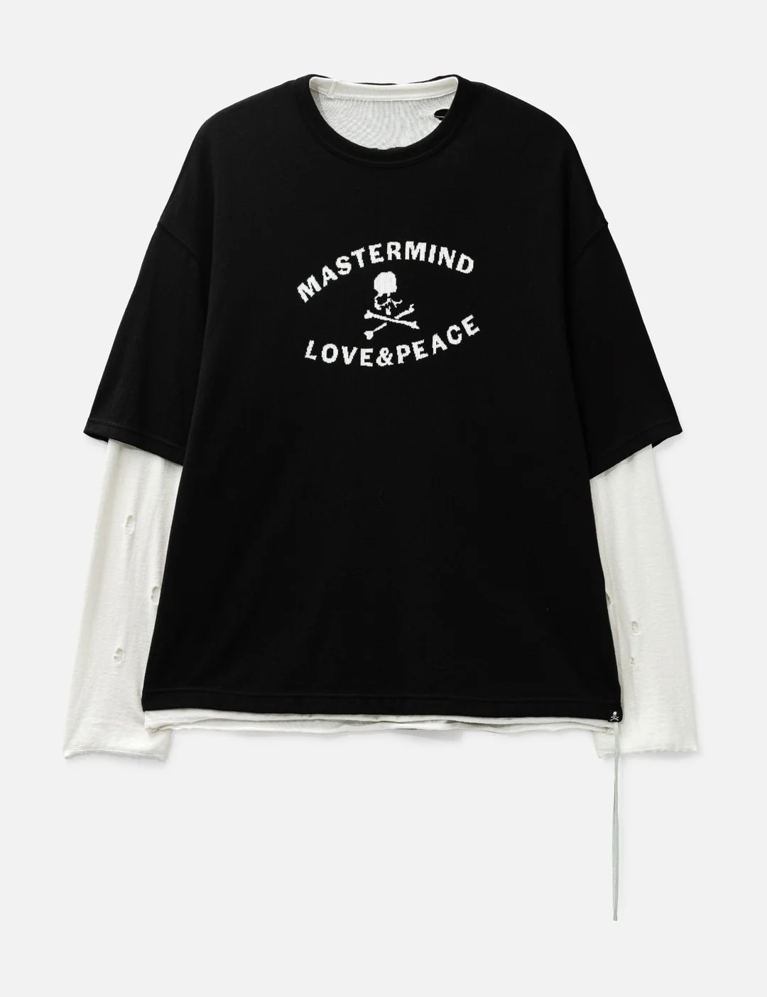 - Mastermind World - Reversible Distressed Tee - Boxy fit - Reversible design - Made of a blend of premium cotton and fine cashmere - Ribbed crewneck - Layered long sleeve - Distressed details on inner side - Made in Japan - Color: Black/ White - Material: 85% Cotton, 15% Cashmere - See more LS T-Shirts, T-Shirts and Clothing - Model wears size M - Model measures: Height 189cm, Chest 35.5”/90cm, Waist 28.5”/72.5cm, Hip 37.5”/95cm - Vendor Code: MW26SE1-KN001-011