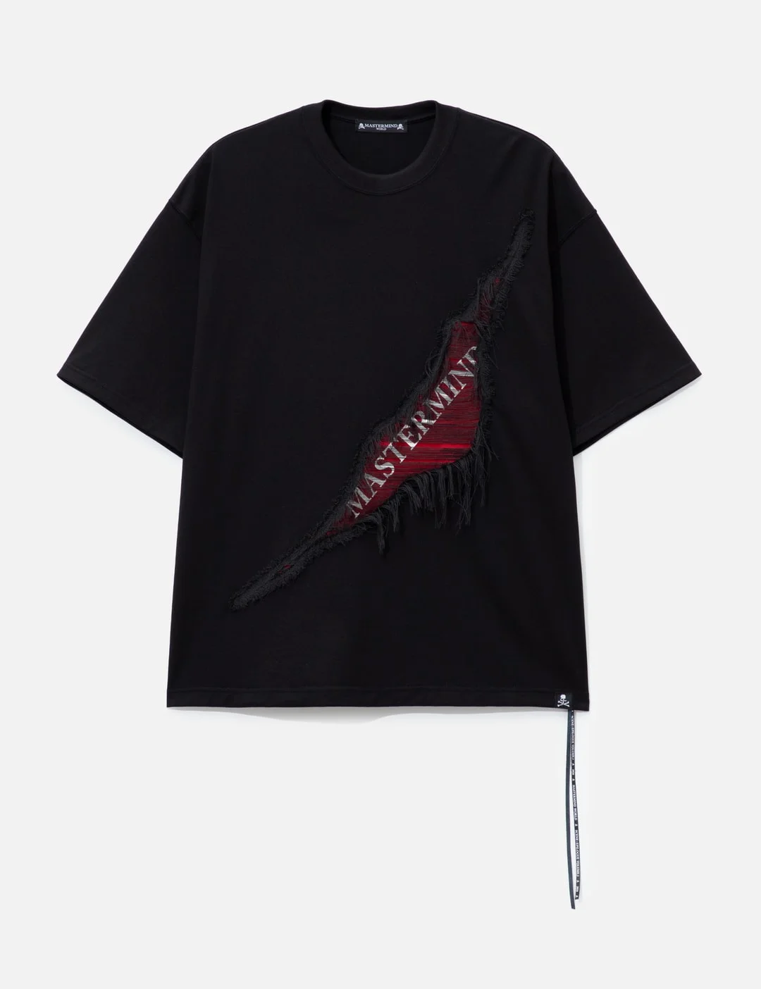 - Mastermind World - Ripped Boxy SS Tee - Made by original jersey knit fabric, blends Suvin Gold and Giza cotton - Advanced odor-neutralizing fibers - Boxy fit - Ribbed crewneck - Short sleeve - Distressed design with loose threads showing graphic under - Made in Japan - Color: Black - Material: 100% Cotton - See more SS T-Shirts, T-Shirts and Clothing - Model wears size M - Model measures: Height 189cm, Chest 35.5”/90cm, Waist 28.5”/72.5cm, Hip 37.5”/95cm - Vendor Code: MW26SE1-TS053-020