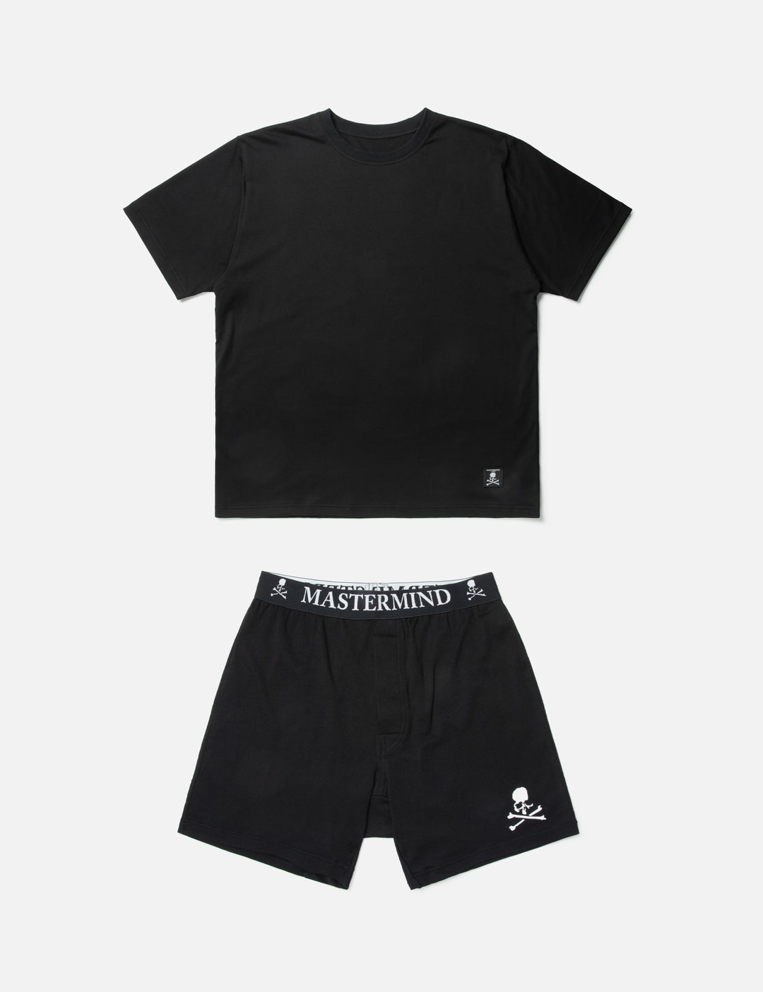 - Mastermind World - T-Shirt & Boxers Set - T-shirt: - Crewneck cotton fabric - Logo patch above hem - Logo print at rear yoke - Straight hem - Boxers: - Elastic logo waistband - Logo detail at leg - Comes in a branded pouch - Color: Black/White - Material: Top: 100% Cotton; Boxers: 100% Cotton - See more Underwear and Accessories