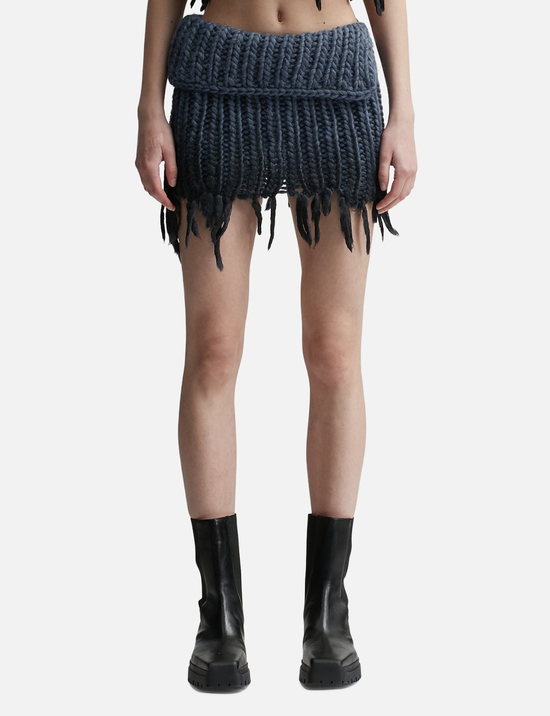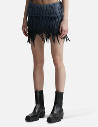 - Misbhv - Coated Bulky Knitted Mini Skirt - Soft wool-blend gradient cable knit construction - Foldover waist - Rear hook closure - Fringed hem - Color: Denim Blue - Material: 85% Wool, 15% Alpaca - See more Skirts and Clothing SIZING - Model wears size XS/S - Model measures: Height 179cm, Chest 32”/81cm, Waist 23’’/58.42cm, Hip 35’’/88.9cm