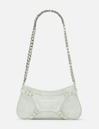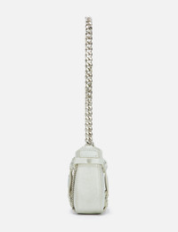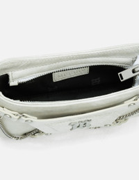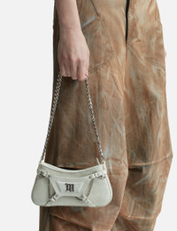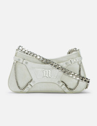 - Misbhv - Leather Fetish Shoulder Bag - Bovine leather outer - Adjustable shoulder strap - Zip closure - Decorative harness with embellished studs - Interlacing metal chain detailing - Gothic M logo at front - Branded lining - Color: Aged White - Material: 100% Bovine Leather - See more Bags and Accessories SIZING Approximate dimensions: - Height: 9cm - Width: 20cm - Depth: 4cm - Strap Length: 26cm