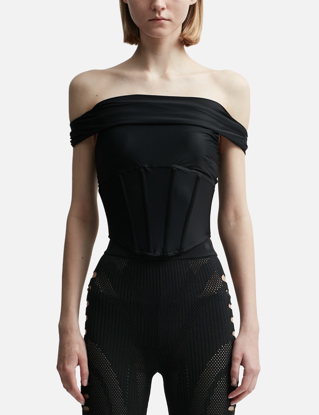 - Misbhv - Pandora Off Shoulder Corset Top - Stretch nylon fabric - Boning detail - Off shoulder - Rear zip closure - Color: Top Black - Material: 76% Polyamide, 24% Elastane - See more Tops and Clothing SIZING - Model wears size S - Model measures: Height 179cm, Chest 32”/81cm, Waist 23’’/58.42cm, Hip 35’’/88.9cm