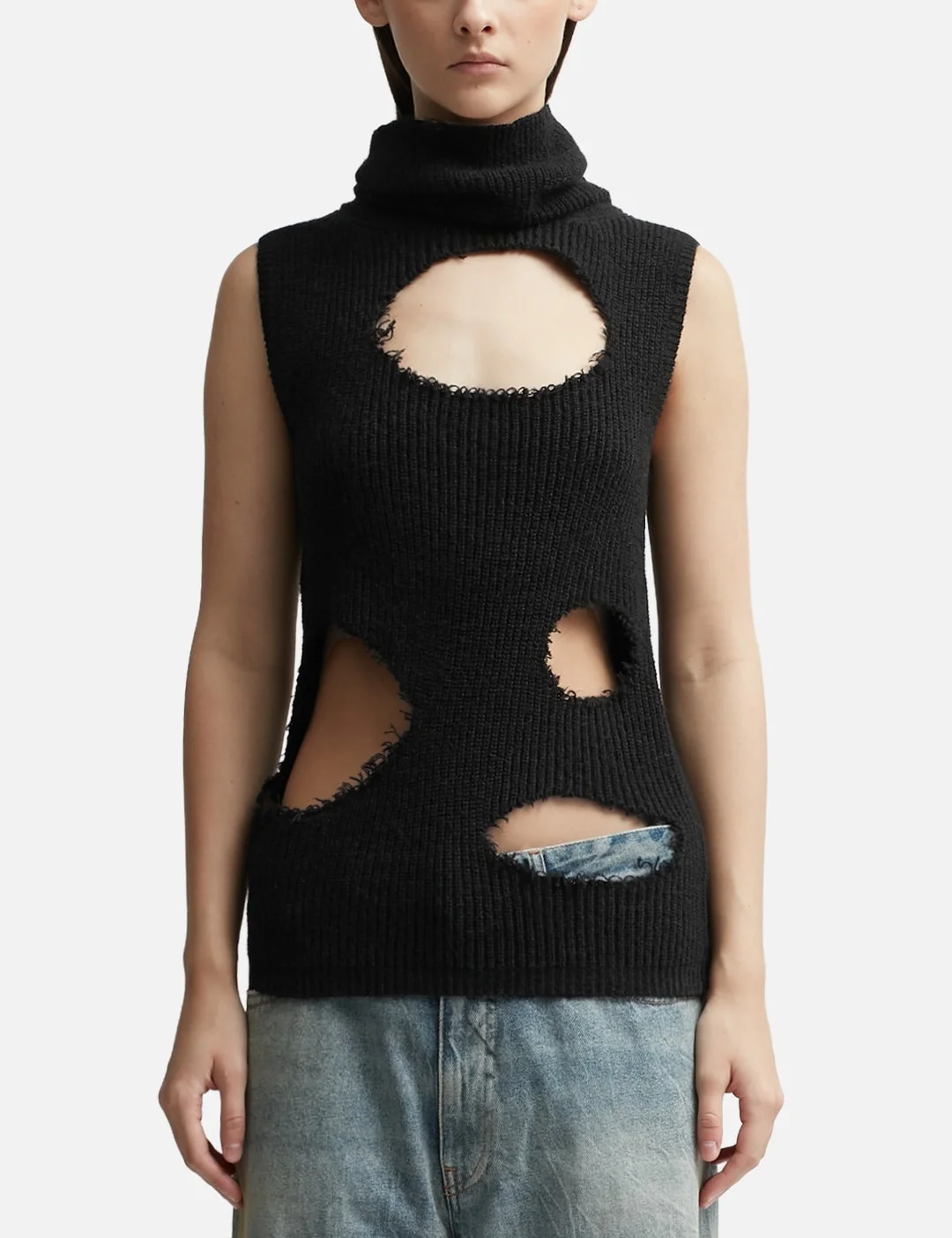 - MM6 Maison Margiela - Distressed Sleeveless Jumper - Roll-neck - Elongated silhouette - Gauge 7 knit - Torn details for distressed aesthetic - Single white stitching at rear - Straight hem - Color: Black - Material: 39% Cotton, 25% Acrylic, 18% Alpaca, 18% Polyamide - See more Knitwear and Clothing - Model wears size S - Model measures: Height 179cm, Chest 33”/83cm, Waist 24.8”/63cm, Hip 35’’/89cm - Vendor Code: S52NC0322S18298900