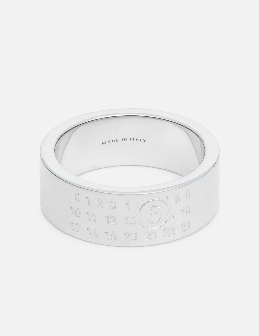 - MM6 Maison Margiela - Minimal Logo 8mm Ring - Polished brass construction - Numeric logo at front - Color: Silver - Material: 100% Brass - See more Jewelry and Accessories - Size: 03 - Inside Diameter: 1.6cm - Size: 04 - Inside Diameter: 1.7cm - Size: 05 - Inside Diameter: 1.8cm - Size: 06 - Inside Diameter: 1.9cm - Size: 07 - Inside Diameter: 2cm - Size: 08 - Inside Diameter: 2.1cm - Size: 09 - Inside Diameter: 2.2cm - Vendor Code: SM6UQ0057P6469951