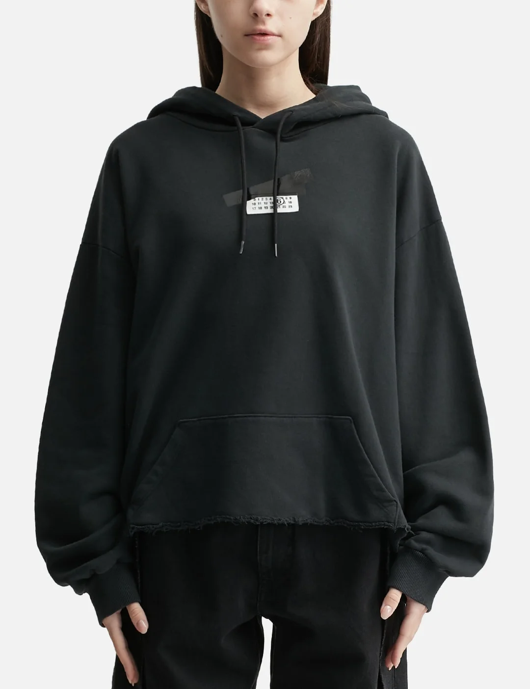 - MM6 Maison Margiela - Sweatshirt - Hood with drawcord - Ribbed cuffs - Art print and brand logo on front - Pouch pocket on front - Raw hem - Signature white stitch on back - Color: Washed Black - Material: 100% Cotton - See more Hoodies and Clothing - Model wearing size S - Model measures: Height 179cm, Chest 32’’/ 81.3cm, Waist 24.5”’/62cm, Hip 34.5’’/88cm - Vendor Code: S62GU0142M25024899