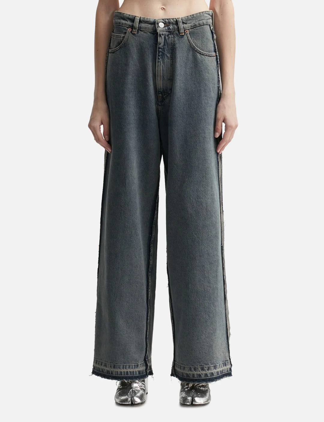 - MM6 Maison Margiela - Wide-leg Jeans - Five pockets - Raw edge finish on side and hem - White stitch line at the back - Numeric signature leather label - Made in Italy - Color: Blue - Material: 100% Cotton; Pocket Lining: 65% Polyester, 35% Cotton - See more Jeans and Clothing - Model wears size 32 - Model measures: Height 186cm, Chest 34”/86cm, Waist 28”/71cm, Hip 36”/91cm - Model wears size 26 - Model measures: Height 177cm, Chest 32”/81cm, Waist 23.5”/59.7cm, Hip 33’’/83.8cm - Vendor Code: SH0LA0025S30844963