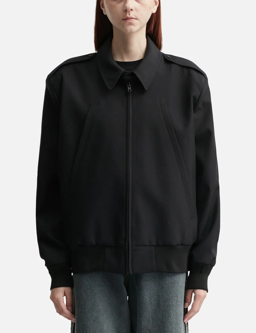 - MM6 Maison Margiela - Wool Bomber Jacket - Made of virgin wool - Structured bomber jacket - Epaulettes on shoulders - Rib-knit cuffs and hem - Slanted welt pockets - White stitching line on back - Made in Italy - Color: Black - Material: 100% Virgin Wool - See more Jackets and Clothing - Model wears size S - Model measures: Height 177cm, Chest 32”/81cm, Waist 23.5”/59.7cm, Hip 33’’/83.8cm - Vendor Code: SH2AM0036M35653900