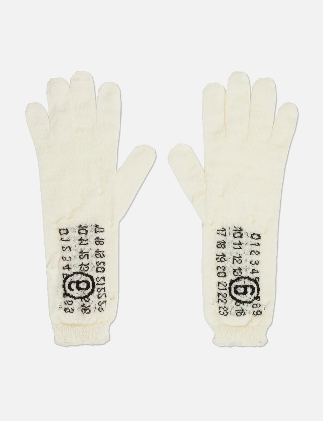- MM6 Maison Margiela - Wool Gloves - Lightweight loose-knit wool fabric - Woven numeric logo - Destroyed details - Elastic cuffs - Color: Off-White - Material: 100% Wool - See more Gloves and Accessories - Size S - Length: 30cm - Size M - Length: 32cm - Size L - Length: 33cm - Vendor Code: S52TS0043M13135103