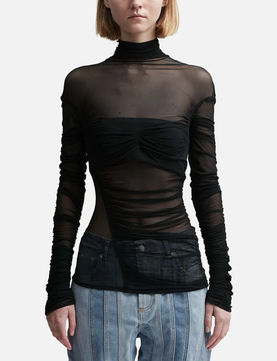 - MUGLER - Ruched Mesh Top - Tight fit - Long sleeves - High-neck - Semi-sheer mesh fabric - Draped effect - Breast underwire - Straight hem - Color: Black - Material: 94% Polyamide, 6% Elastane - See more Tops and Clothing SIZING - Model wears size 36 - Model measures: Height 179cm, Chest 32”/81cm, Waist 23’’/58.42cm, Hip 35’’/88.9cm