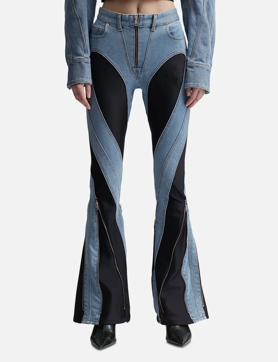 - MUGLER - Zipped Bi-Material Jeans - High-waist - Slim cut - Zip fly with inner button closure - Flared - Paneled and cut-out design - Five-pocket design - Zipped seams - Branded patch on rear waist - Color: Medium Blue - Material: Main Fabric: 72% Cotton, 28% Elastomultiester; Fabric 2: 78% Polyamide, 22% Elastane - See more Jeans and Clothing SIZING - Model wears size 36 - Model measures: Height 179cm, Chest 32”/81cm, Waist 23’’/58.42cm, Hip 35’’/88.9cm