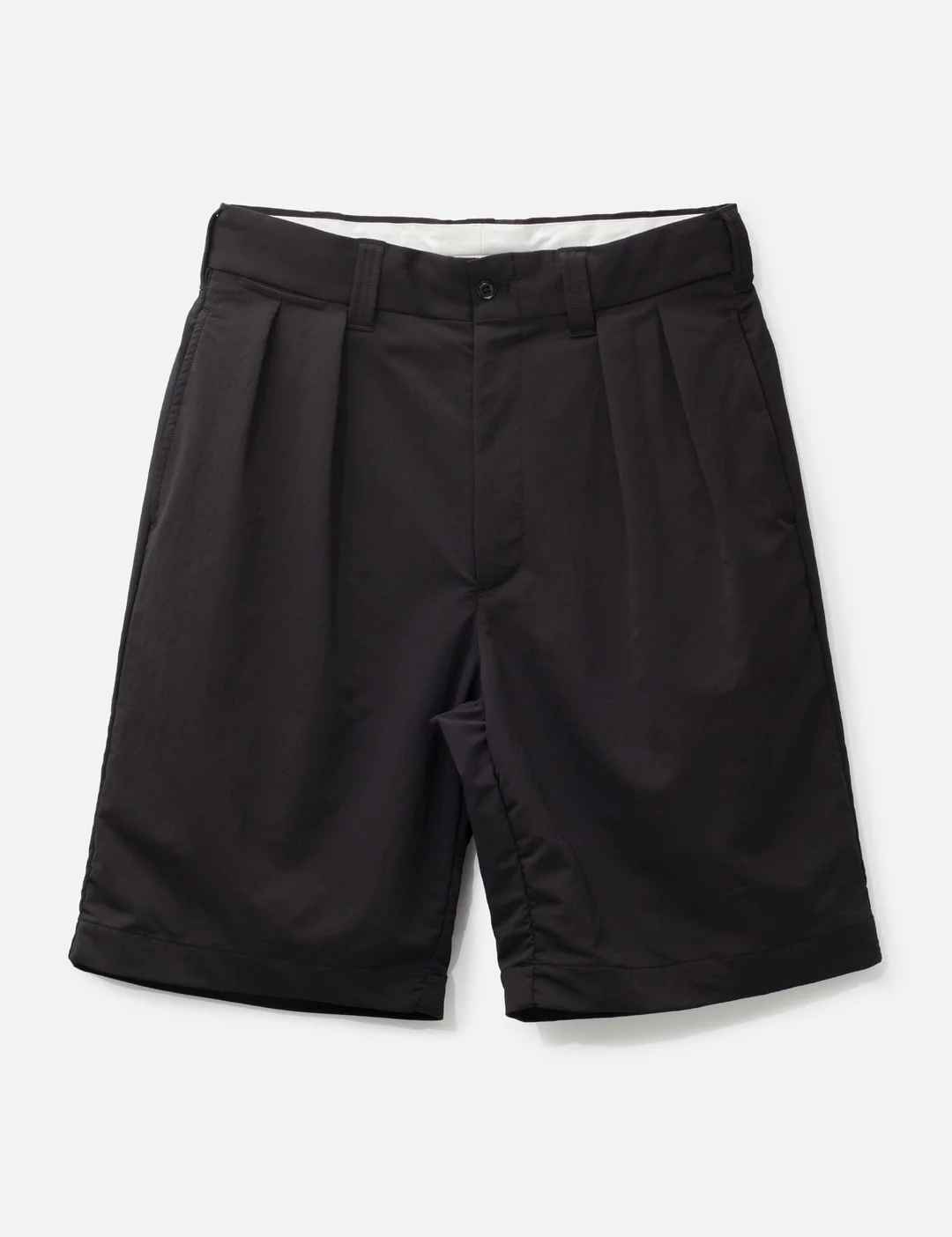 - Nanamica - ALPHADRY Double Pleat Shorts - Wide-cut - Made from ALPHADRY® fabric - Moisture-wicking, quick-drying and stretch properties - Waistband with hidden drawcord - Front zipper closure - Two front pockets and one coin pocket - Two back buttoned pockets - Color: Black - Material: 76% Polyester, 24% Elasterell Polyester - See more Shorts and Clothing - Model wears size 32 - Model measures: Height 186cm, Chest 34”/86cm, Waist 28”/71cm, Hip 36”/91cm - Vendor Code: S26SD065E