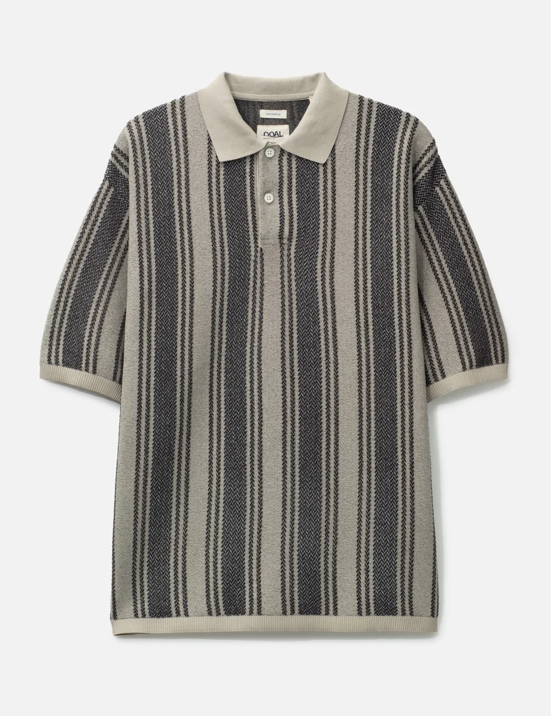 - Nanamica - Knit Polo Sweater - Relaxed, oversized fit - Made from recycled polyester lilly yarn - Polo collar - Half-buttoned closure - Allover striped knit pattern - Short sleeves - Brand label at hem - Color: Charcoal - Material: 100% Polyester - See more Polos and Clothing - Model wears size M - Model measures: Height 186cm, Chest 34”/86cm, Waist 28”/71cm, Hip 36”/91cm - Vendor Code: S26SH019E