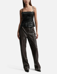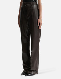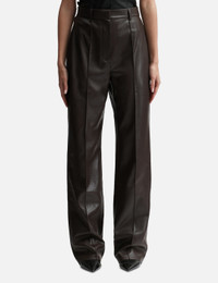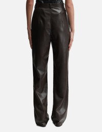 - Nanushka - Leena - Okobor™ Alt-Leather pants - Relaxed fit - High waist - Made from signature slip satin - Slim legs that pool at the ankles - Pressed creases through the front - Color: Coffee Ground - Material: 81% Acetate, 19% Polyester Recycled; Lining: 100% Cotton - See more Pants and Clothing SIZING - Model wears size S - Model measures: Height 175cm, Chest 33”/83.8cm, Waist 23”/58.4cm, Hip 34”/86.4cm