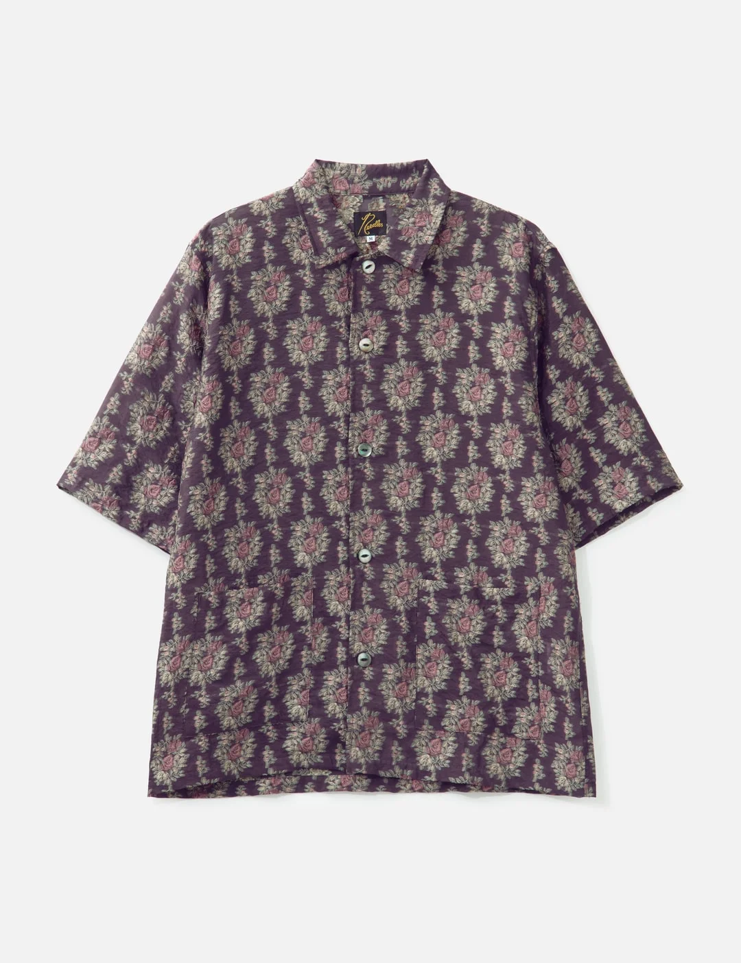 - Needles - Cabana Shirt - Textured cupra-blend fabric - Relaxed fit - Open camp collar - Floral jacquard pattern - Full button placket - Short sleeves - Two front slip pockets - Straight hem - Made in Japan - Color: Purple - Material: 50% Cupra, 34% Polyester, 16% Nylon - See more Shirts and Clothing - Model wears size M - Model measures: Height 187cm, Chest 34”/84cm, Waist 26”/67cm, Hip 36”/88cm - Vendor Code: RW278