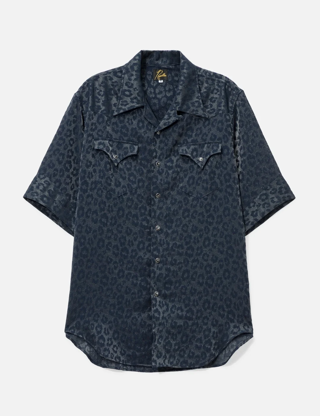 - Needles - Short Sleeves Western Shirt - Rayon Leopard Jacquard - Made of glossy rayon and nylon fabric - Leopard pattern allover - Pointed collar - Decorative snap buttons - Short sleeves - Two flap chest pockets - Curved hem - Color: B-Navy - Material: 80% Rayon, 20% Nylon - See more Shirts and Clothing - Model wears size M - Model measures: Height 186cm, Chest 34”/86cm, Waist 28”/71cm, Hip 36”/91cm - Vendor Code: SX274