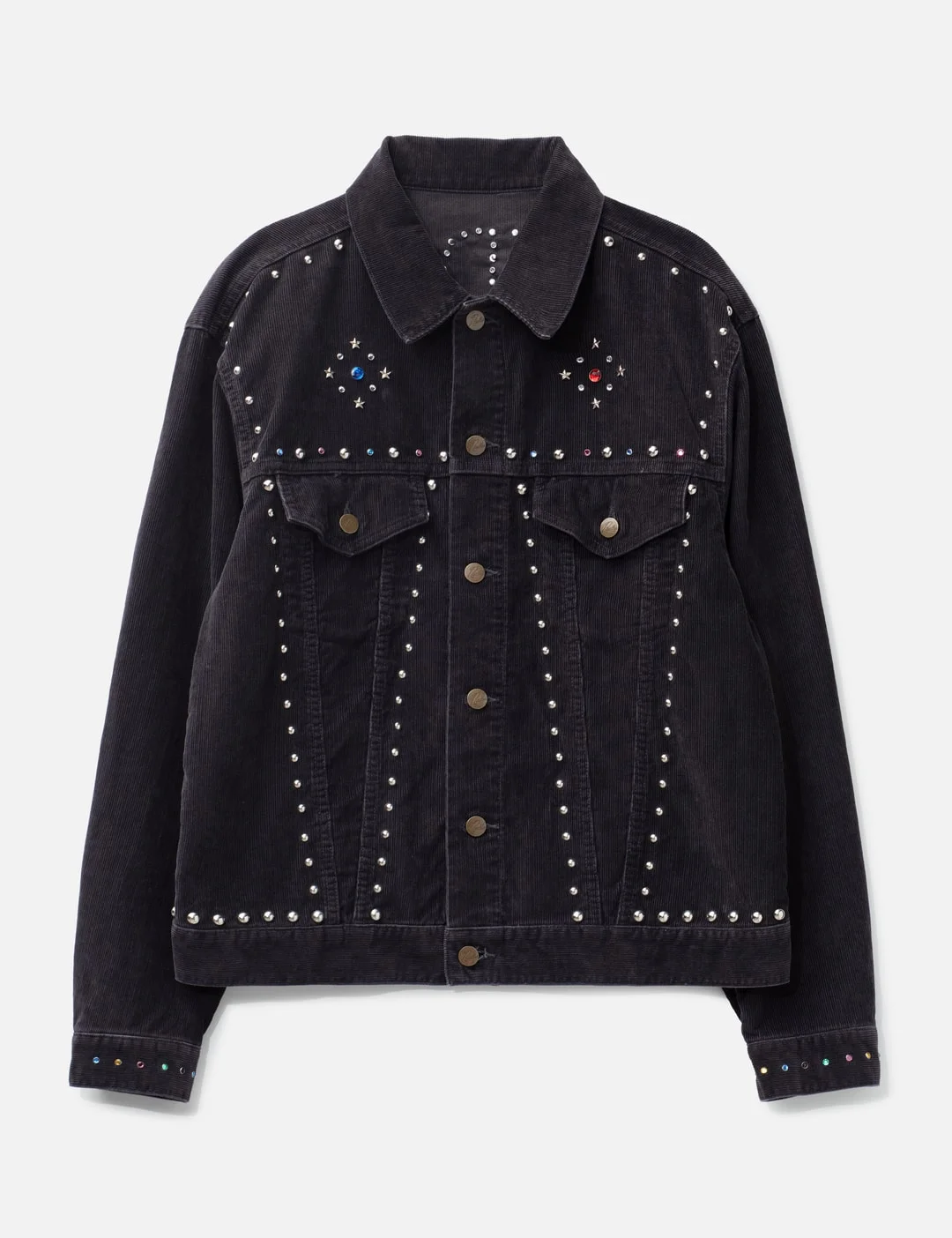 - Needles - Studded Jean Jacket - Made of ribbed corduroy fabric - Standard collar - Button closure - Two chest flap pockets - Multi-colored rhinestones and studs throughout - Signature butterfly embroidery at back - Button adjusters at hem - Made in Japan - Color: Purple - Material: 85% Cotton, 15% Polyester - See more Jackets and Clothing - Model wears size M - Model measures: Height 186cm, Chest 34”/86cm, Waist 28”/71cm, Hip 36”/91cm - Vendor Code: RW167