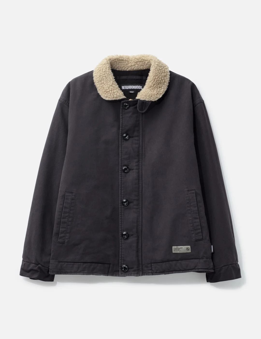 - NEIGHBORHOOD - N-1 Deck Jacket - Made of sulfur-dyed German cord cloth - Natural fading effect over time - Collar made of boa fabric - Branded buttoned and zipper closure - Inner ribbed details at cuffs - Two front pockets - Brand tag on front and side seam - Hem with drawcord - Printed distressed-style logo at the back - Quilted lining - Color: Black - Material: Shell: 100% Cotton; Body Lining: 100% Cotton; Sleeves Lining: 100% Polyester - See more Jackets and Clothing - Model wears size M - Model measures: Height 188cm, Chest 38”/96cm, Waist 30”/78cm, Hip 37”/94cm - Vendor Code: 252SZNH-JKM01