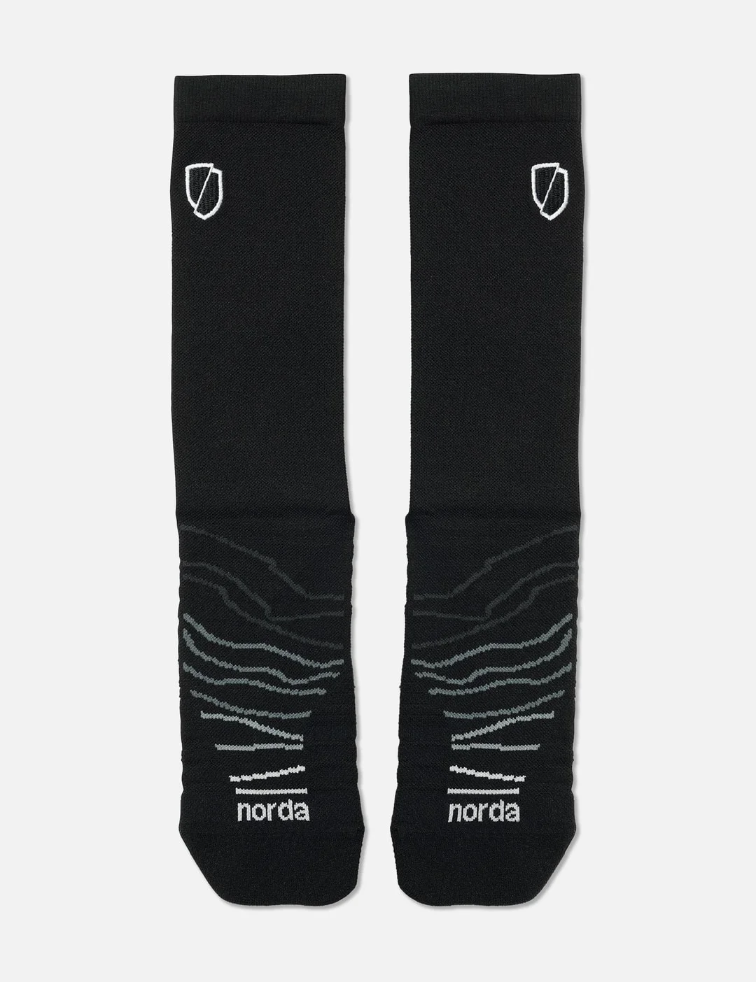 - norda - Performance Sock - Crew length - Embroidered shield logo - Topographical relief print - Cushioned and ventilated sole - Reinforced stress zones for maximum durability - Color: Black - Material: 93% Nylon, 7 % Elastane - See more Socks and Accessories - Size S - Max. Length: 34cm - Heel to Toe: 17cm - Size M - Max. Length: 38cm - Heel to Toe: 19cm - Size L - Max. Length: 42cm - Heel to Toe: 21cm - Vendor Code: Performance Sock / Black