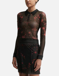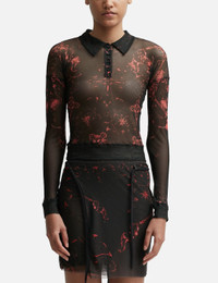 - Ottolinger - Mesh Polo Top - Fitted - Mesh semi-sheer construction - Graphic print throughout - Polo collar - Button placket - Long sleeves - Straight hem - Color: Skribbl Red - Material: 90% Recycled Polyester, 10% Elastane - See more Tops and Clothing SIZING - Model wears size XS - Model measures: Height 177cm, Chest 29”/74cm, Waist 23.6”/60cm,Hip 34.6’’/88cm