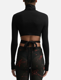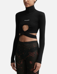 - Ottolinger - Otto Wrap Loop Top - Fitted - Mock neck - Long sleeves - Metal branding on the chest - Cut-out design - Tie details - Cropped hem - Color: Black - Material: 97% Organic Cotton, 3% Elastane - See more Tops and Clothing SIZING - Model wears size XS - Model measures: Height 177cm, Chest 29”/74cm, Waist 23.6”/60cm,Hip 34.6’’/88cm