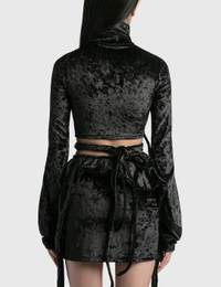 - Ottolinger - Velvet Wrap Loop Top - Long sleeves - Cropped cut - High neck - Soft, velvet-like texture - Cut-out detailing - Lined - Color: Black - Material: 90% Polyester, 10% Spandex - See more Tops and Clothing SIZING - Model wears size S - Model measures: Height 170cm, Chest 29”/75cm, Waist 22”/57cm, Hip 33”/86cm