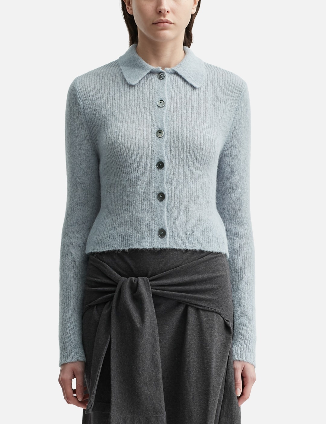 - Our Legacy - Mazzy Polo - Spread collar - Button closure - Long sleeves - Cropped hem - Mother-of-pearl hardware - Color: Livid Blue Fuzze - Material: 55% Alpaca, 30% Polyamide, 15% Wool - See more Knitwear and Clothing SIZING - Model wears size 34 - Model measures: Height 175cm, Chest 32’/81cm, Waist 24.5’’/61.2cm, Hip 35’’/88.9cm