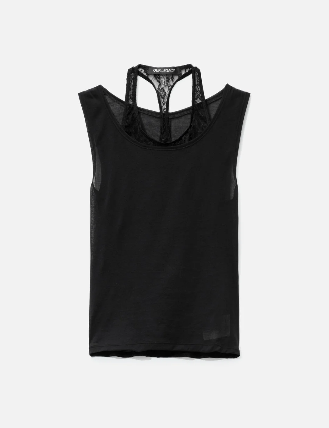 - Our Legacy - Swim Tank - Made of Japanese stocking jersey fabric of cotton and nylon - Fitted silhouette - Double-layered - Slightly lower front neckline - Classic tank back - Sheer lace inner layer - Reversible design - Color: Black Stocking Jersey - Material: 70% Cotton, 30% Nylon - See more Tanks and Clothing - Model wears size 34 - Model measures: Height 179cm, Chest 31’’/79cm, Waist 24’’/61cm, Hip 36.4’’/92.5c - Vendor Code: W2266SB