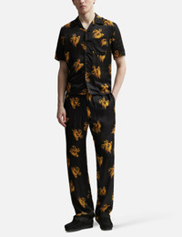 - Palm Angels - Burning Monogram Shirt - Short sleeves bowling shirt - Button closure - All-over burning monogram motif - Single chest pocket - Straight hem - Color: Black/Gold - Material: 100% Viscose - See more Shirts and Clothing SIZING - Model wears size 44 - Model measures: Height 187cm, Chest 36”/91cm, Waist 28”/72cm, Hip 36”/91cm