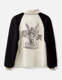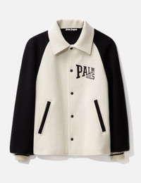- Palm Angels - University Jacket - Snap button closure - Embroidery at chest and rear - Two front pockets - Contrasting black sleeves - Fully lined in cupro - Color: White - Material: 100% Wool - See more Jackets and Clothing - Vendor Code: UNIVERSITY JACKET - Model wears size 48 - Model measures: Height 187cm, Chest 36”/91cm, Waist 29”/74cm, Hip 37”/94cm