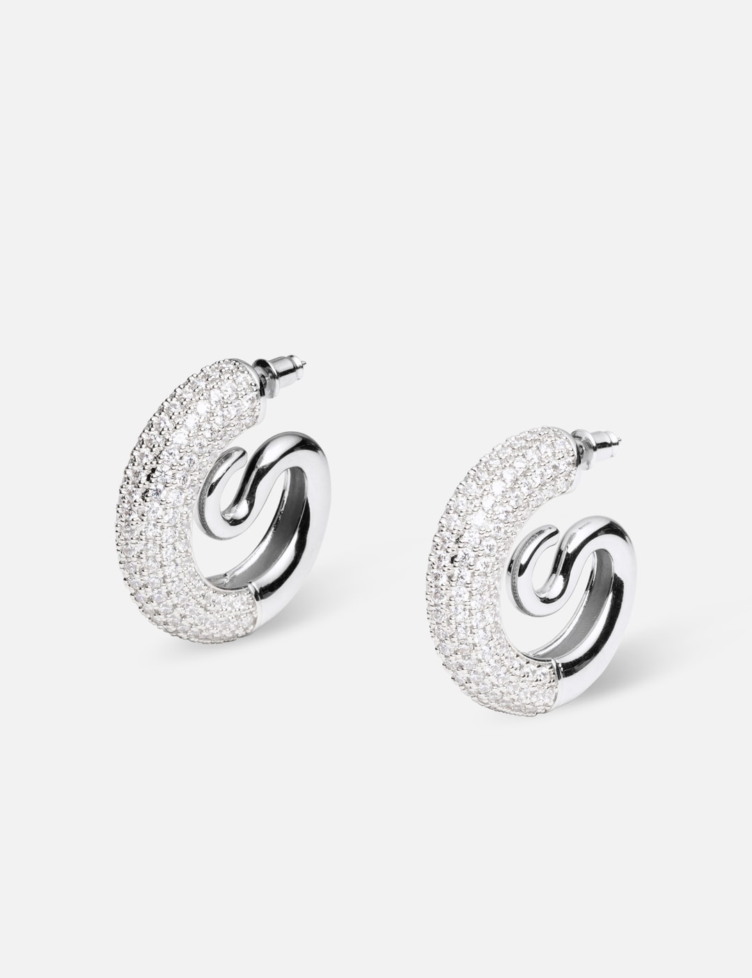 - Panconesi - Small Kismet Serpent Hoops - Spiral shaped - Crystal embellishment - Stud closure - Sold as a pair - Color: Silver - Country Of Origin: IT - Material: 925 Silver - See more Jewelry and Accessories SIZING Approximate measurement: - Width: 3cm - Length: 3cm