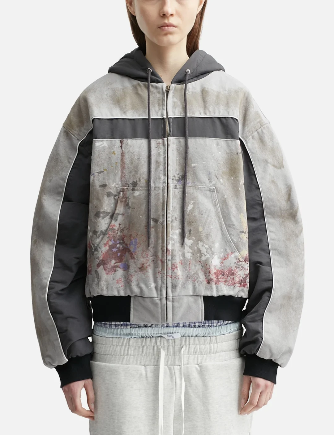 - Praying - Dirty Sports Jacket - Nylon and canvas hybrid construction - Oversized fit with volume - Hood with drawstring - Concealed front zipper closure - Paint splatter print detail - Two front pockets - Ribbed cuffs and hem - Quilted lining - Color: Gray - Material: Nylon, Cotton - See more Jackets and Clothing - Vendor Code: PRAY240922