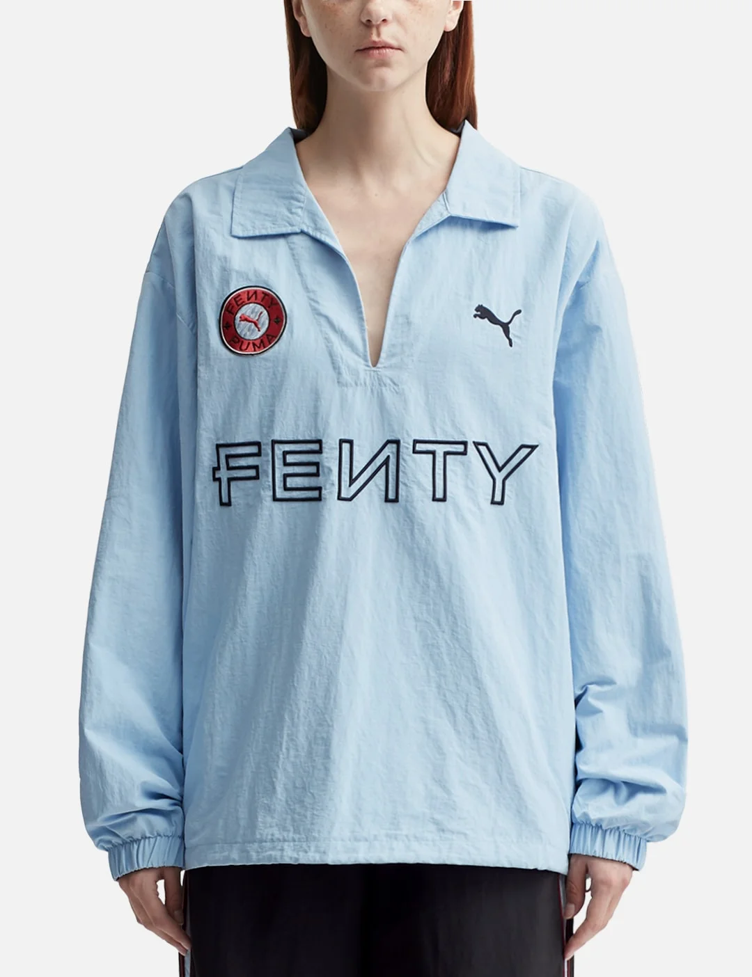 - Puma - PUMA x FENTY Nylon Drill - PUMA x SKEPTA collaboration - Made with recycled plain weave fabric - Oversized fit - Long length - V-neck - Long Sleeves - Elastic cuffs - FENTY x PUMA co-branding embroideries at front - Color: Haute Tropic - Material: 100% Nylon - See more LS T-Shirts, T-Shirts and Clothing - Model wears size S - Model measures: Height 186cm, Chest 34”/86cm, Waist 28”/71cm, Hip 36”/91cm - Model wears size XS - Model measures: Height 177cm, Chest 32”/81cm, Waist 23.5”/59.7cm, Hip 33’’/83.8cm - Vendor Code: 63573448