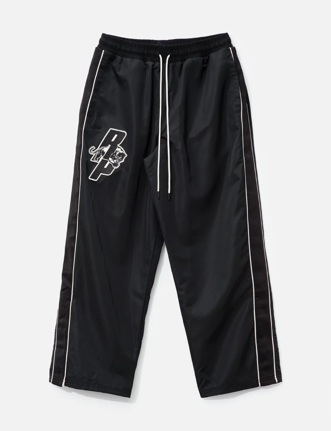 - Puma - Puma x Represent Men's Pants - Puma x Represent collaboration - Regular fit - Slightly flared leg - Made of polyester - Elastic waistband with drawcord - Two side pockets - Represent logo patch on front - Pipping details along sides - Ventilation design at cuffs with snap buttons - Two back pockets - Embroidered Represent label at back pocket - Mesh lining - Color: Puma Black - Material: 100% Polyester - See more Pants and Clothing - Model wears size M - Model measures: Height 186cm, Chest 34”/86cm, Waist 28”/71cm, Hip 36”/91cm - Vendor Code: 63580301