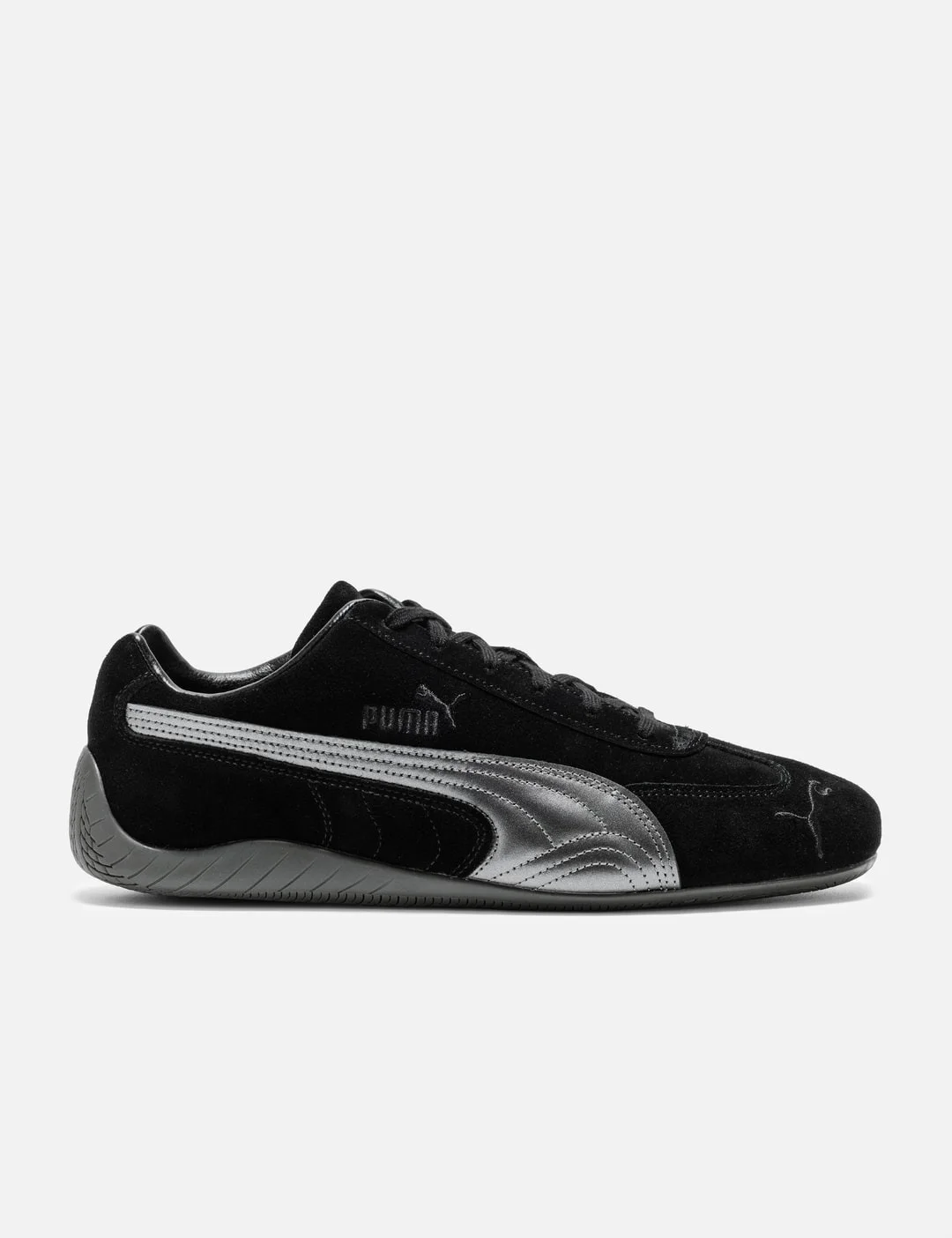 - Puma - Speedcat Lux - Suede upper - Metallic Formstrip - Lace-up closure - Rounded toe - PUMA Cat details - Foil-debossed accents - Rubber outsole - Color: PUMA Black/ Gum - Material: Suede, Rubber - See more Sneakers and Shoes - Vendor Code: 40819802