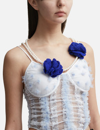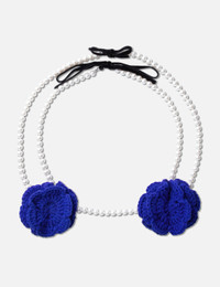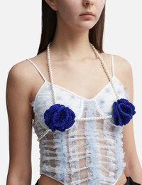 - PUSHBUTTON - Crochet Pearl Bra Necklace - Pearl necklace with crochet flower details - Wear it as a statement piece over neck or around bust - Color: Multi - See more Tops and Clothing SIZING Approximate measurement: - Max. Length: 120cm