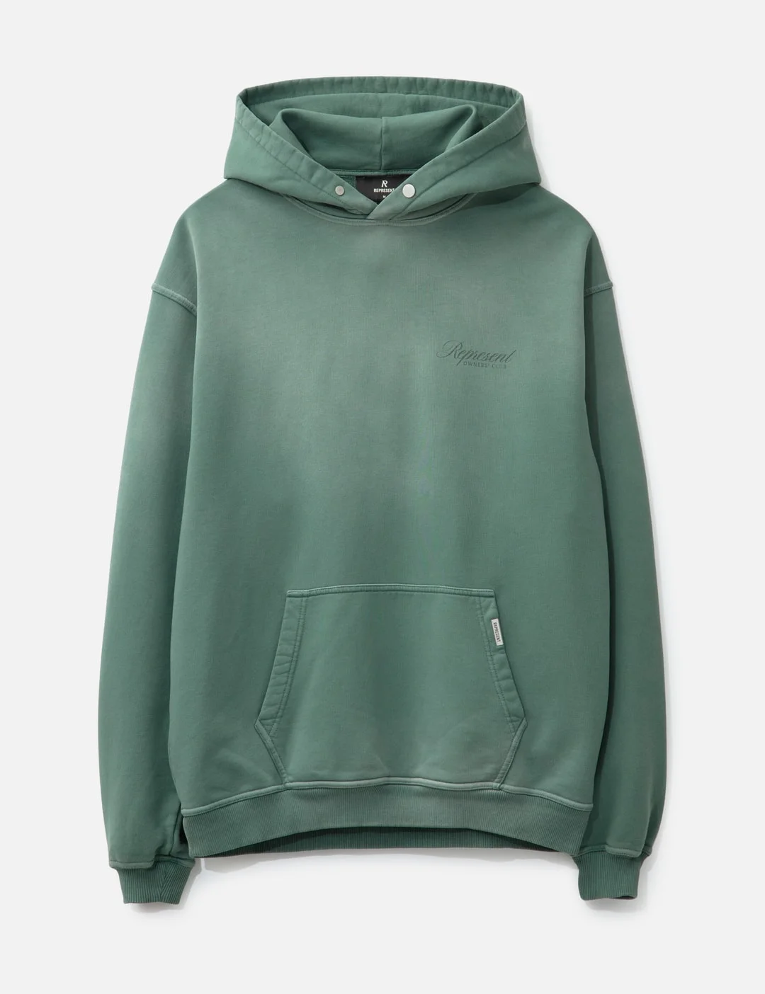 - Represent - Represent Owners’ Club Script Hoodie - Made of 480gsm heavyweight jersey cotton - Slightly oversized fit - Pre-shrunk - Loopback Jersey - Cobrax Popper on hood - Owners’ Club print on chest and back - Metal bar logo on the pocket - Ribbed hems and cuffs - Color: Vintage Green - Material: 100% Cotton - See more Hoodies and Clothing - Model wears size M - Model measures: Height 186cm, Chest 34”/86cm, Waist 28”/71cm, Hip 36”/91cm - Vendor Code: OCM41200