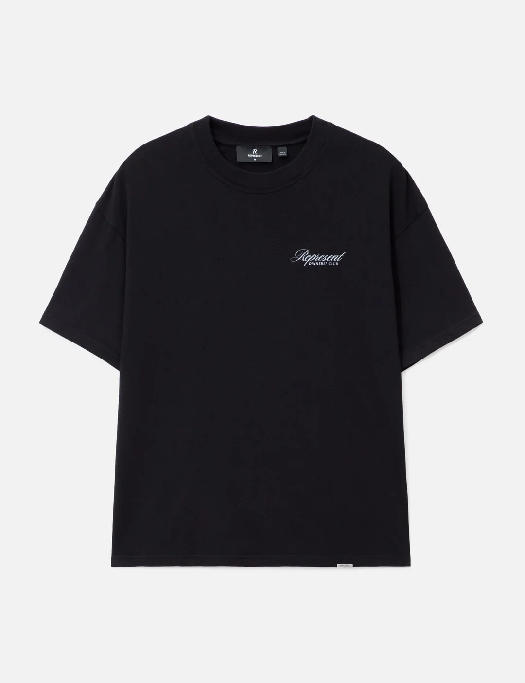 - Represent - Represent Owners' Club Script T-Shirt - Made of 220 gsm mediumweight cotton - Oversized fit - Ribbed crewneck - Short sleeves - Screen printed on chest and back - Represent metal bar logo - Color: Black - Material: 100% Cotton - See more SS T-Shirts, T-Shirts and Clothing - Model wears size M - Model measures: Height 186cm, Chest 34”/86cm, Waist 28”/71cm, Hip 36”/91cm - Vendor Code: OCM41201