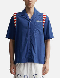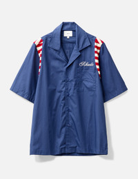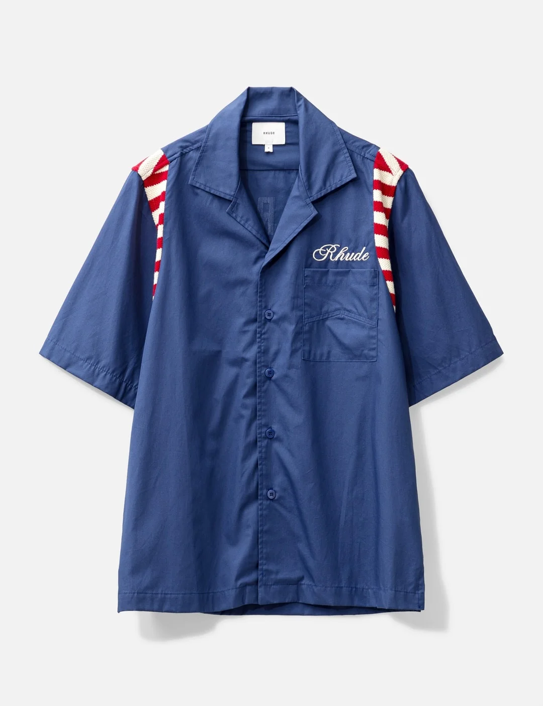 - Rhude - American Spirit Poplin Shirt - Cotton button-up shirt - Relaxed and comfortable fit - Short sleeves - Front button closures - Rhude logo embroidered on the front - Rhude American spirit design on the back - Flat hem - Color: Navy - Material: 100% Cotton - See more Shirts and Clothing - Vendor Code: RHPS24SR01320302 - Model wears size M - Model measures: Height 186cm, Chest 35”/89cm, Waist 30.5”/78cm, Hip 35.5”/91cm