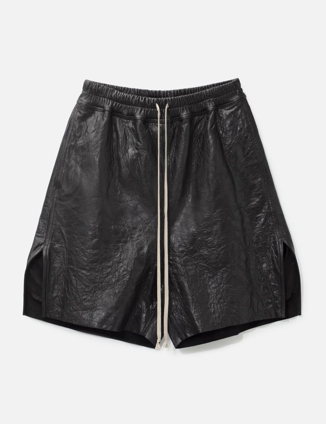 - Rick Owens - Boxers In Tumbled Lamb Leather - Made of mediumweight lamb leather - Knee-length - Elasticized waistband with drawstring - Slightly dropped crotch - Two side welt pockets - Beveled side splits - Color: 09 Black - Material: 100% Lamb Leather; Lining 100% Cupro - See more Shorts and Clothing - Model wears size 46 - Model measures: Height 186cm, Chest 34”/86cm, Waist 28”/71cm, Hip 36”/91cm - Vendor Code: RU01F2397-LBE