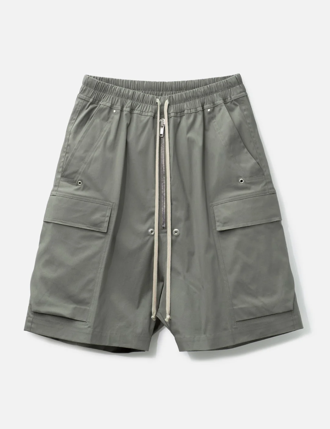 - Rick Owens - Cargobela Shorts - Made of cotton and elastane - Knee-length - Wide leg - Elasticized waistband with drawstring - Bela exposed center zipper - Snap detail at bottom - Low crotch - Two front welt pockets - Two beveled cargo pockets with snap on the sides - Two back snap pockets - Color: 35 Euca - Material: 97% Cotton, 37% Elastane - See more Shorts and Clothing - Model wears size 46 - Model measures: Height 186cm, Chest 34”/86cm, Waist 28”/71cm, Hip 36”/91cm - Vendor Code: RU01F2360-TE