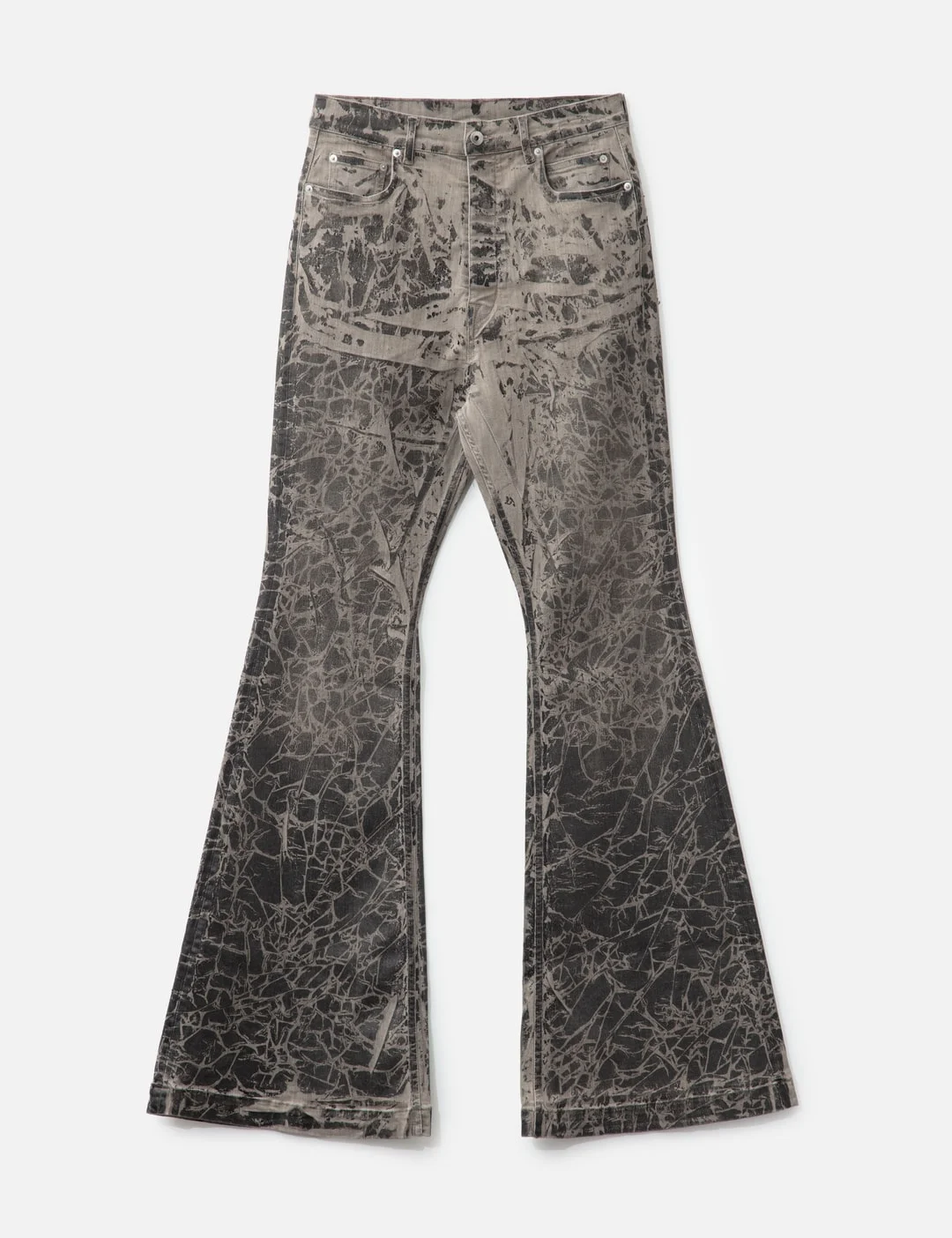 - Rick Owens Drkshdw - Bolan Bootcut - Made on a 10oz lightweight washed foil denim - Natural stretch denim - Bleached into a dirty pearl color - Washed black foil overlay - High-waisted - Slim fit - Floor-length boot cut - Concealed zip fly with top button - Waistband with pocket rivets - 6-pocket - Rear patch pockets with topstitching - Color: Black Washed Foil - Material: 91% Cotton, 6% Elastomultiester, 3% Rubber Fiber - See more Jeans and Clothing - Model wears size 30 - Model measures: Height 190cm, Chest 32”/84cm, Waist 32”/81cm, Hip 34”/86cm - Vendor Code: DU02E7365-SDWF