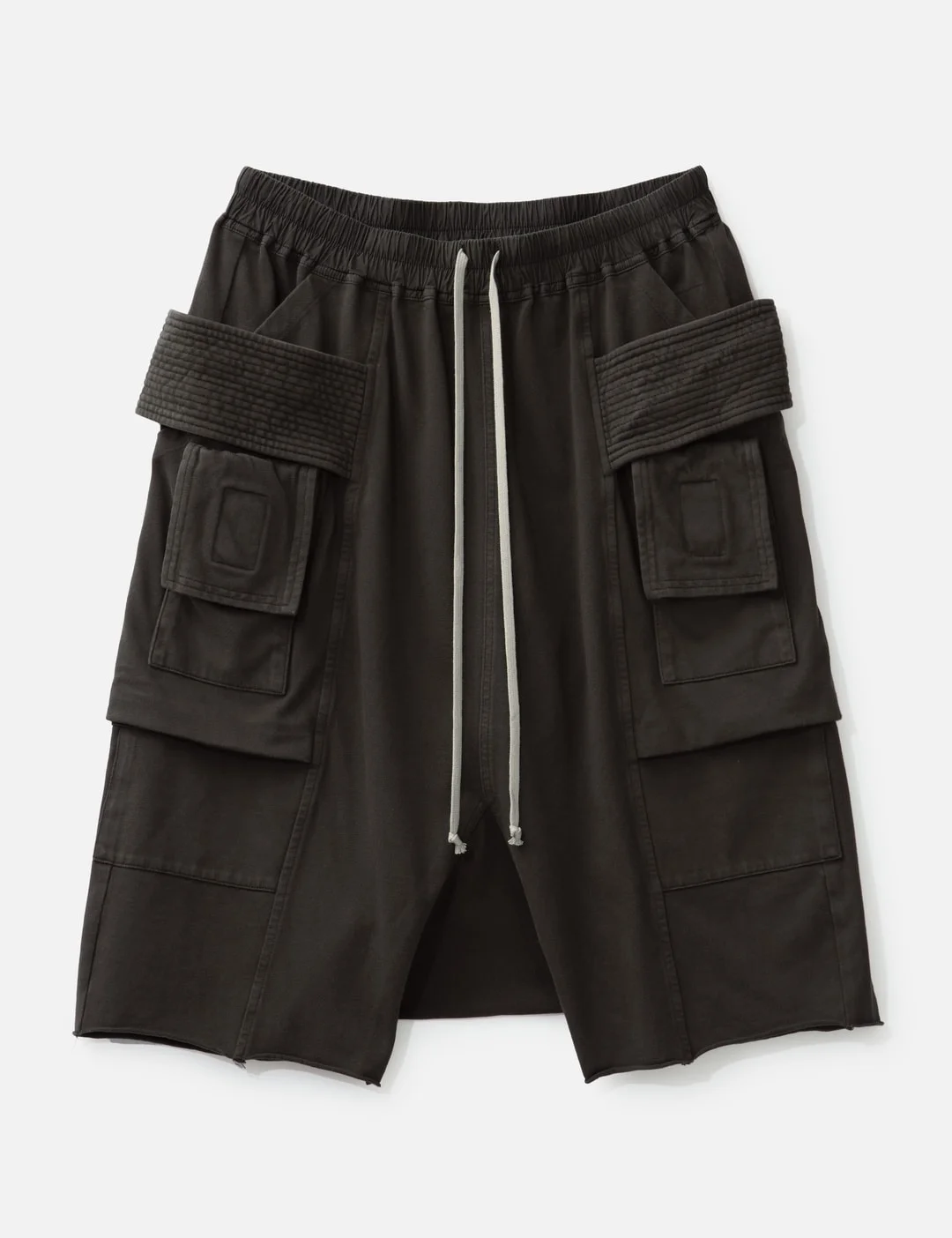 - Rick Owens Drkshdw - Creatch Cargo Pods - Made of heavyweight and compact cotton jersey - Garment dyed - Gots certified organic cotton used - Below knee length - Elastic waistband with drawstring - Stitched fly - Dropped crotch - Wide center panel - Layered front pockets with side belt straps - Signature stitching lines - Two flap pockets with topstitching - Color: Dark Dust - Material: 100% Cotton - See more Shorts and Clothing - Model wears size M - Model measures: Height 186cm, Chest 34”/86cm, Waist 28”/71cm, Hip 36”/91cm - Vendor Code: DU02E7382-RIG